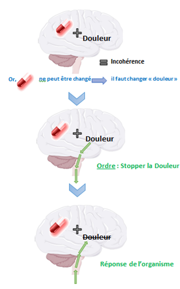 Comme la coexistence d’une douleur et d’un traitement est contraire à la raison, et comme le sujet ne peut pas supprimer le traitement, il en vient à supprimer la douleur : troisième fondement de l’effet Placebo.