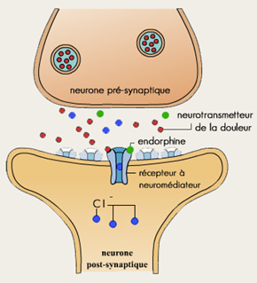 Les messages nerveux (comme celui de la douleur) cheminent sous forme d’activité électrique à travers l’axone jusqu’à la synapse. Au bout des axones, dans les zones appelées « bouton terminal », les messages électriques sont traduits sous forme chimique et provoque l’exocytose. Des molécules du neurone pré-synaptiques libèrent leur contenu dans le milieu synaptique : des neurotransmetteurs. Ces substances se combinent à des récepteurs post-synaptiques et les messages de la douleur continuent leur chemin vers le cortex cérébral après avoir été retraduits en messages électriques. Mais avec l’endorphine, le passage de la synapse diffère : les endorphines viennent se fixer sur les récepteurs à neuromédiateurs du neurone post-synaptique et ouvrent le passage de ce récepteur.