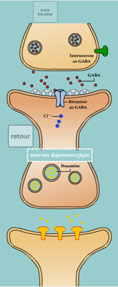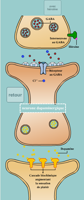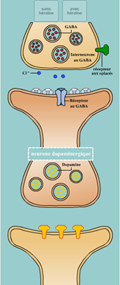 Les images ci-dessus montrent deux synapses consécutives au niveau de l’ATV. Le premier neurone (inter neurone au GABA) est spécifique de l’ATV. Le neurone central est dit dopaminergique, c'est à dire qu'il est capable de sécréter de la dopamine. Le dernier neurone quant à lui est capable de réagir à la présence de dopamine (première image). Ici, c’est l’héroïne qui est utilisée car elle peut être associée aux endorphines (deuxième image). La molécule béta-endorphine se fixe sur le récepteur aux opiacés du premier neurone. Celui-ci sécrète une faible dose de neurotransmetteur GABA. Le canal au chlore du neurone post synaptique ne s’ouvre que peu de temps. Le neurone sera faiblement polarisé et donc excité. Il sécrète alors beaucoup de dopamine qui suite à ça, donnera une sensation de bien-être (troisième image).