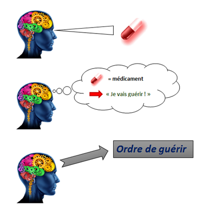 La perception extérieure comporte une part de réalité, mais englobe aussi une part d’interprétation faite par le cerveau, ce que nous montrent nos sens. Toutefois, le cerveau est incapable de faire instantanément la distinction entre une représentation mentale qui concorde avec la réalité et une représentation mentale qui n’est qu’une illusion. Notre comportement n’est donc pas ajusté à la réalité en soi, mais aux représentations mentales que nous en avons. Nous agissons en fonction de ce que nous attendons. C’est pourquoi, notre comportement, parfois, est la cause de la conséquence attendue. L’influence de ces représentations mentales peut intervenir au-delà du comportement et ainsi agir sur le métabolisme du corps. Ce mécanisme est dit de « suggestion » ou « d’autosuggestion ». Son principe repose sur la méthode Coué qui consiste à répéter une phrase positive jusqu’à ce que l’on ne puisse plus distinguer la part du réel et la part d’invention. Ainsi répéter « je vais guérir » provoque une diminution du stress et un gain de confiance en soi. Une expérience sur les réactions allergiques donne une preuve à ce phénomène : un homme a subi un choc anaphylactique à la vue de roses artificielles. Les roses n’étant pas la cause, cette réaction serait due à la représentation mentale du choc anaphylactique. La théorie du conditionnement et celle de la suggestion ne sont pas opposées, mais bien complémentaires. Mais il est difficile de faire la différence entre conditionnement et suggestion. En effet, si la prise d’un médicament dans le cadre du conditionnement conduit à la guérison du patient, ça suppose qu’il fait l’association « Je prends un cachet, je vais guérir ». Le conditionnement ne dépend pas de la pensée et de la raison puisqu’il s’agit d’un phénomène mécanique. Quant à la suggestion, elle repose sur ces faits.
