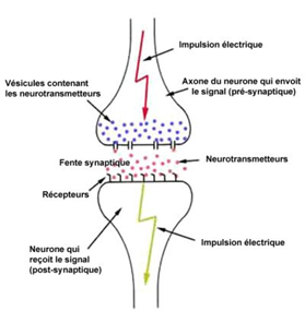 La transmission de ces messages se fait au niveau des « bras » des neurones, que l’on nomme axone. Le neurone qui envoie le message est dit « pré synaptique » et celui qui le reçoit « post synaptique ». Les neuromédiateurs voyagent dans la partie que l’on appelle « la fente synaptidique ». Ils sont contenus dans les vésicules du premier neurone et sont libérés par « exocytose » (rejetés de la cellule). Ces neuromédiateurs sont ensuite réceptionnés par les récepteurs (à canaux ioniques) situés sur le neurone post synaptique. Le message est ainsi transmis de neurones en neurones. Ce complexe (schéma ci-contre) s’appelle un synapse.